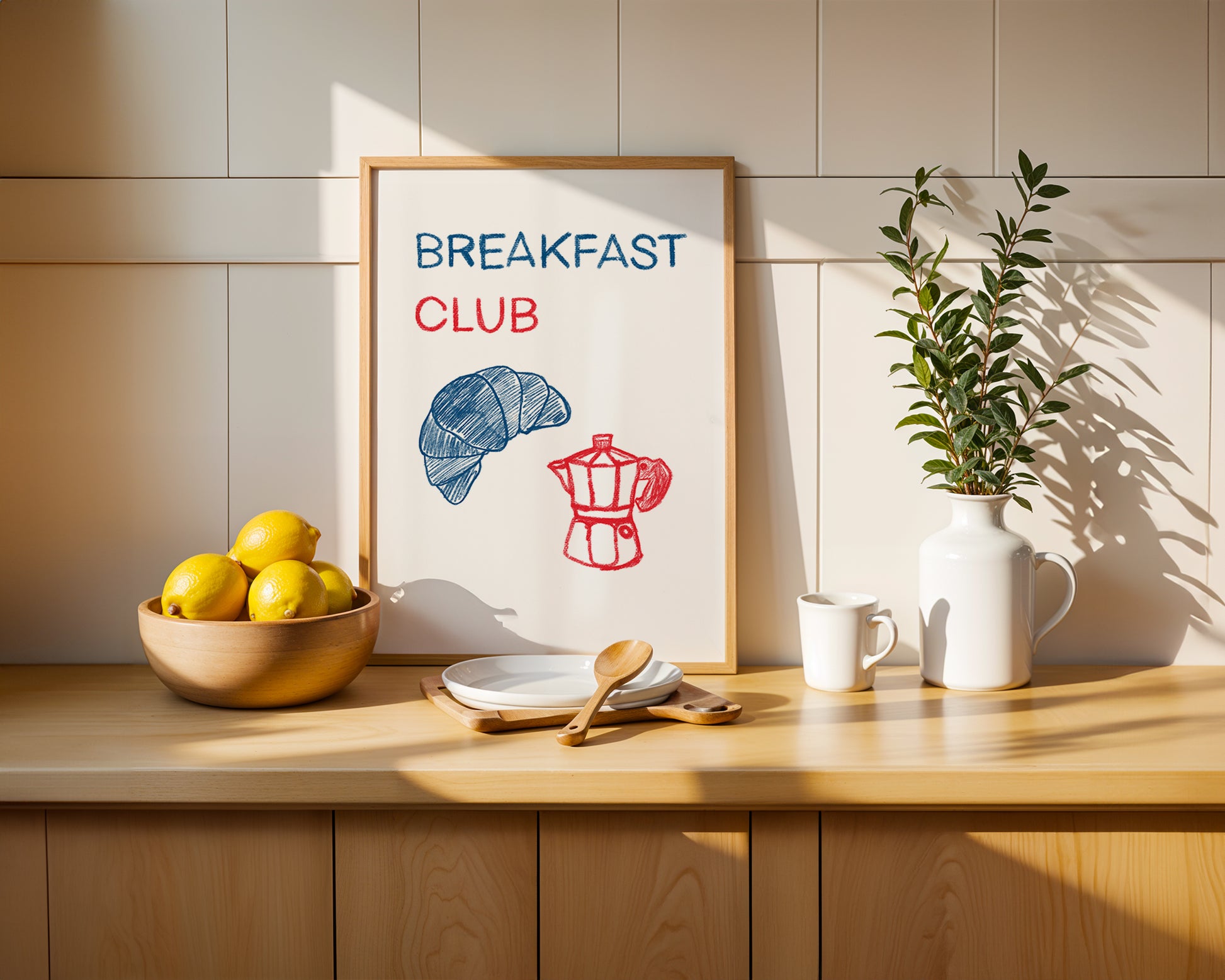 Start your day with style with the “Breakfast Club” art print. This charming design features a hand-drawn croissant and a classic moka pot in bold red and blue tones, paired with playful typography that reads “BREAKFAST CLUB.”