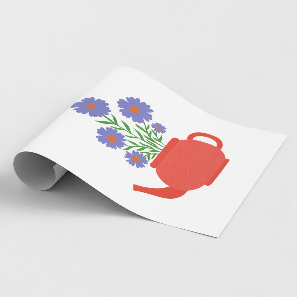 Add a touch of charm and nature to your space with the “Floral Teapot” art print. This delightful design features a vibrant coral teapot filled with blooming purple flowers and lush green stems, creating a fresh and cheerful composition.